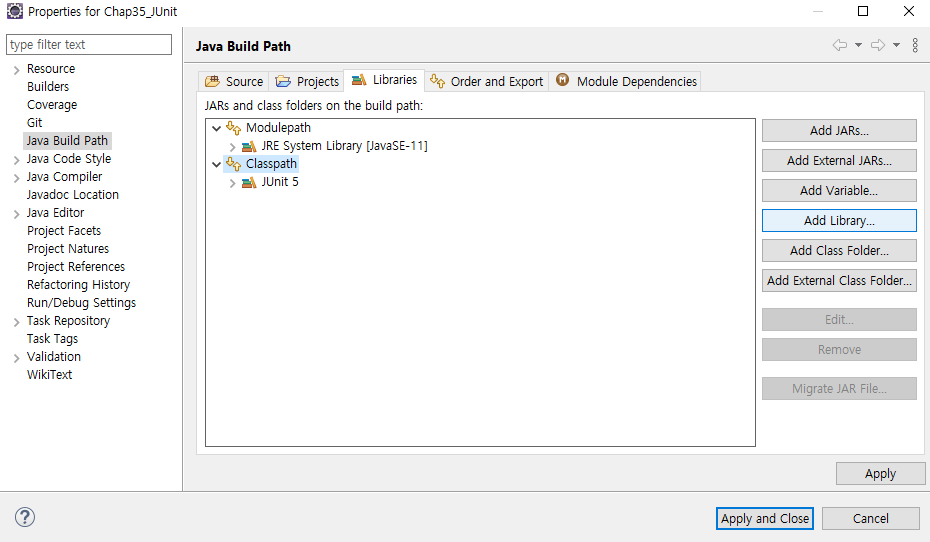 프로젝트 폴더 > 우클릭 > Properties(속성) 선택 > JavaBuildPath > Library > ClassPath > 우측 add Library > JUit 선택
