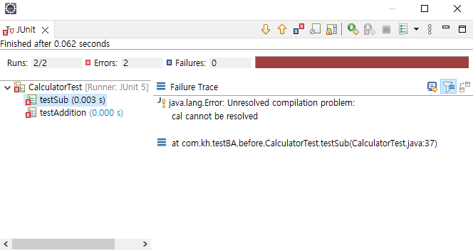 그리고 아까 인스턴스를 생성하지 않은 상태로 실행한 결과와 달리 JUnit결과에 Failures가 2건이라고 뜨네요.
