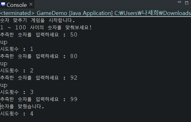 //6. 숫자를 맞추고 게임을 종료할 때