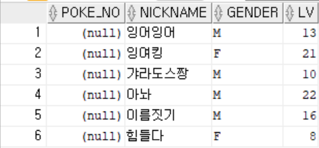 | poke_no | poke_name | main_type | sub_type | nickname | gender | lv |