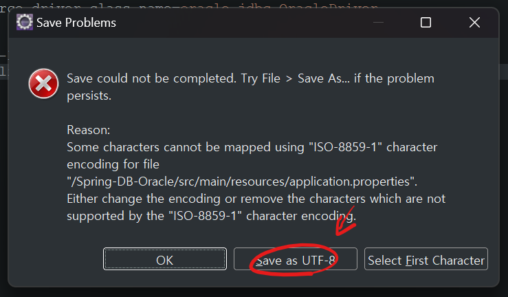 그리고 저장을 누르면 경고창 하나가 뜨는데 UTF-8 선택해주심 됩니다