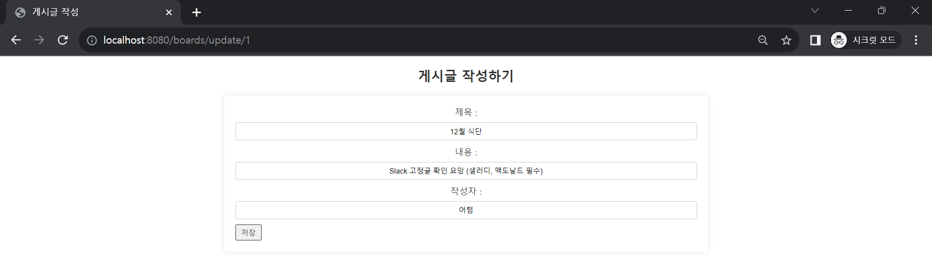 이 친구의 경우는, board_id값이 이미 존재하는 경우 /update 주소로 보내져, 존재하는 게시물을 수정할 수 있게끔 합니다.